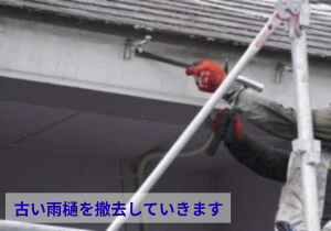 古い雨樋を丁寧に取り外し、周囲を傷つけないよう作業します。