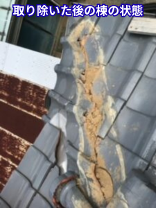 屋根を確認したところ、棟の下の土が劣化して崩れやすい状態でした💦