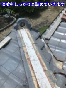 棟の隙間に漆喰を詰め、雨水が入りにくい状態に仕上げます。