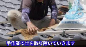 瓦を少しずつ外して、棟の下にある古い土を丁寧に取り除きます。