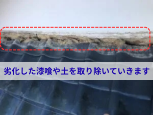 また、屋根頂部の「土居のし瓦」を固定している漆喰が劣化し、ひび割れや剥がれが目立ちました。