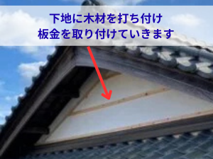 下地に銅縁(どうぶち:板金を固定する木材)を打ち付け、新しい角波板金を貼ることで、雨仕舞い(雨水の侵入を防ぐ仕上げ)を強化します。