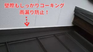 壁際は雨漏りしやすい部分なので、二重の水切り板金とコーキング(すき間を埋める処理)でしっかり防水しました。