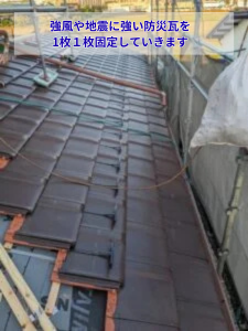 防災瓦を一枚一枚丁寧に設置。特殊なロック構造で、強風時にもズレや飛散を防ぎます。