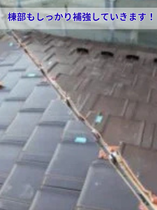 屋根の頂点部分にあたる棟部をしっかり補強。ここは雨漏りの原因になりやすいため、細心の注意を払い仕上げました。