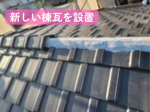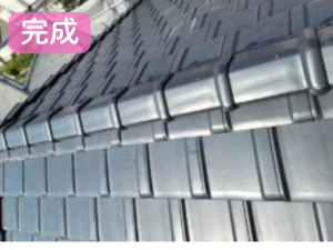 引掛け工法で1枚ずつ丁寧に施工し、棟部分は南蛮漆喰で仕上げ、耐震・耐風性を高めました。