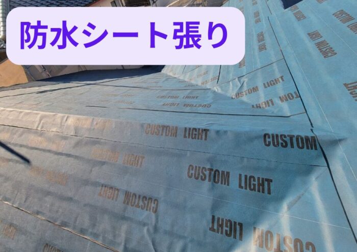 新しい屋根材を設置する前に防水シートを全面に施工。