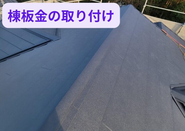 屋根の最上部に棟板金を取り付け、強風時の飛散を防止。