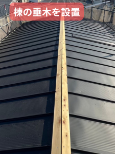 屋根の頂点部分に木材の骨組み(垂木)を取り付けます。新しい棟板金を固定するための土台となります。