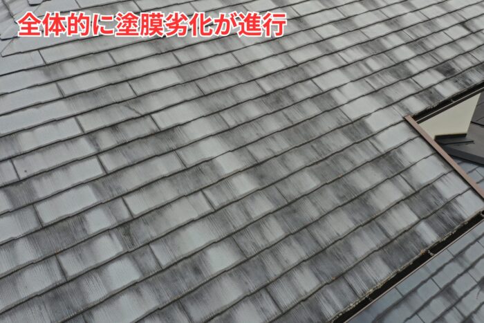 屋根全体が白っぽく色あせており、塗膜がほとんど機能していません。