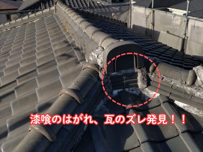 「漆喰が剥がれ、棟の端部で瓦がズレています。雨水が入りやすい状態でした☔」