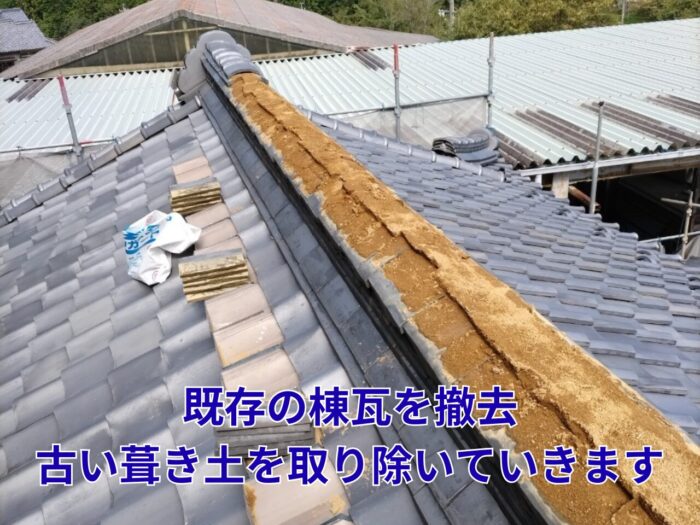 瑞浪市釜戸町で棟瓦の歪みと劣化土を確認!伝統和瓦の棟積み替え工事で雨漏り予防
