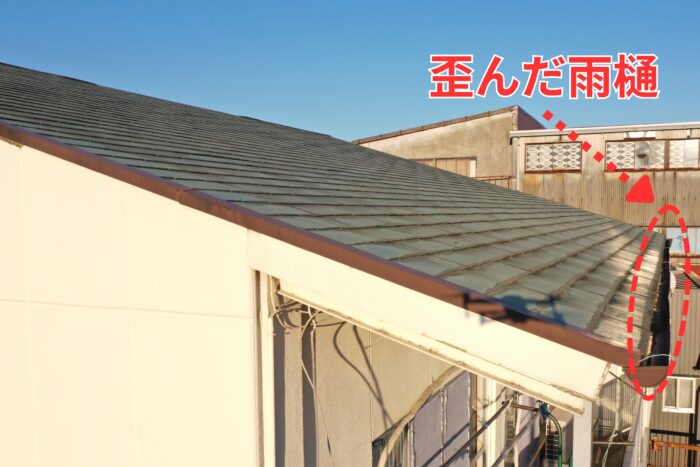 今回、屋根の軒先部分を横から確認したところ、雨樋が外側へわずかに歪んでいる箇所が見受けられました。