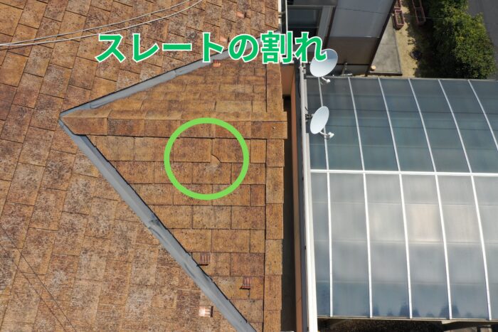 ドローンによる屋根点検の際、スレート屋根の一部に割れや欠けが複数確認できました。