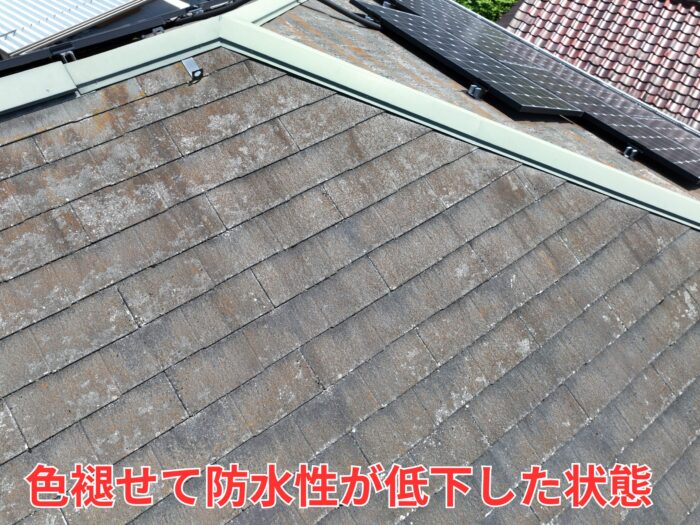 まず確認できたのは、スレート屋根の広範囲な色褪せと防水機能の低下です。